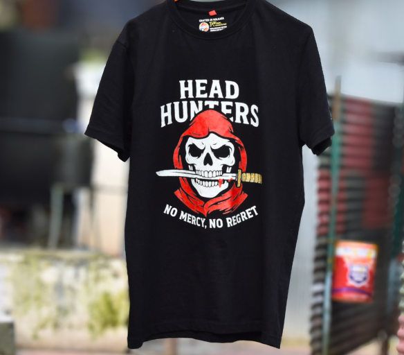 ✨ Front Design: “HEAD HUNTERS – No Mercy No Regret” skull artwork.