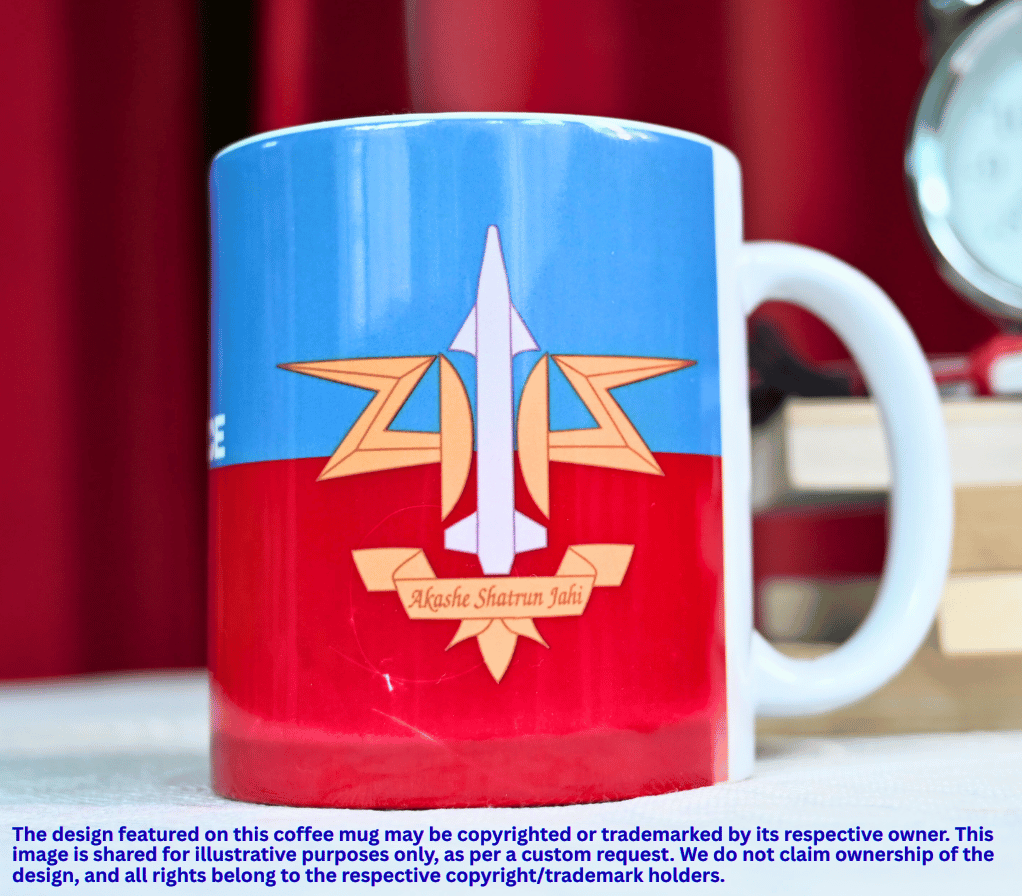 Illustration of custom coffee mug with Army Air Defence logo, Akash Shatru Bhedte text, and flag-inspired background