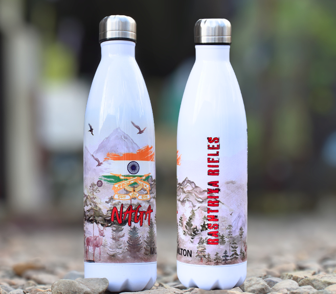 750ML cola shaped thermos bottle printed with Rashtriya Rifles logo and text