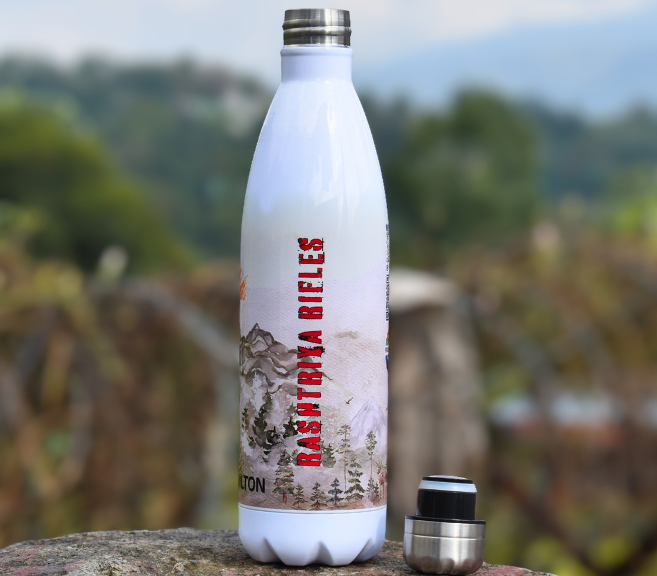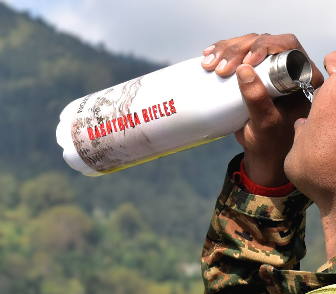 Army person drinking from Rashtriya Rifles 750ML cola shaped thermos bottle